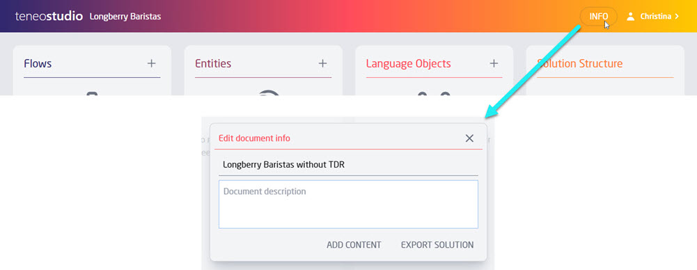 - Solution dashboard: the top ribbon now includes an Info button which allows to edit the solution name and description as well as the options to Export Solution and Add Content; when updating a solution's name, the Save button becomes available in the top ribbon after closing the Edit document info box.
